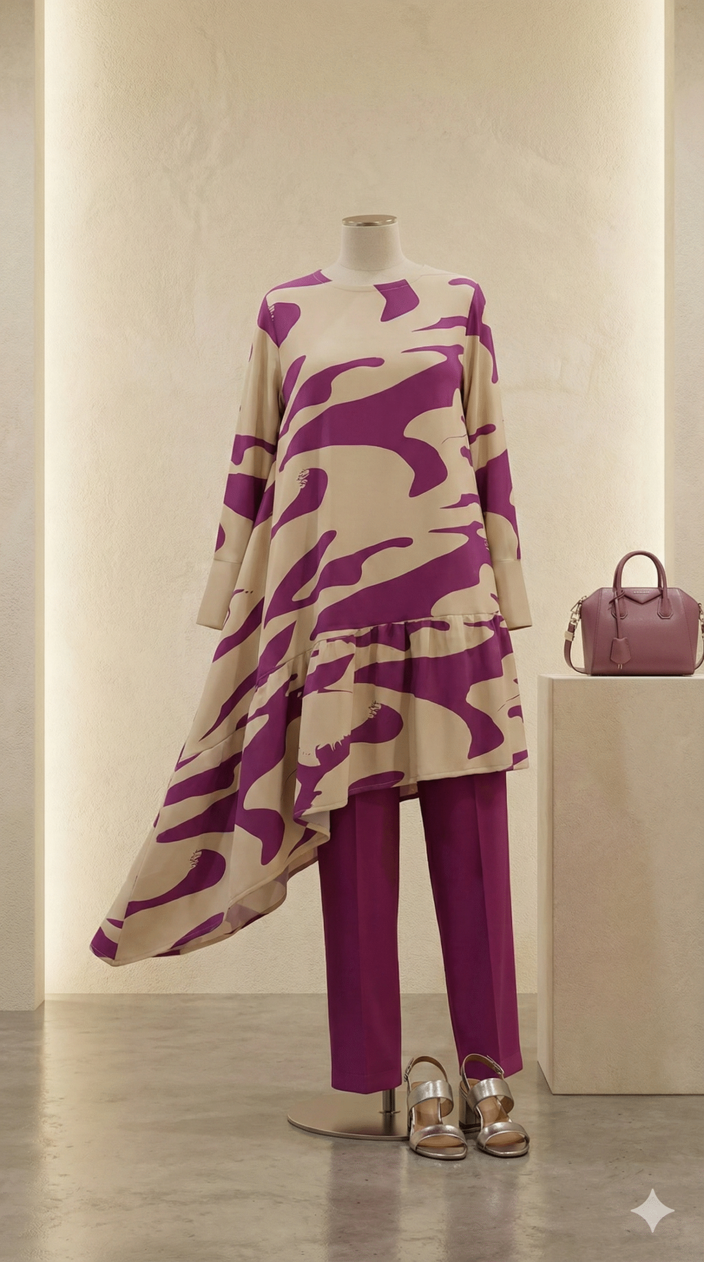 La pièce maîtresse est une tunique longue et fluide sur fond crème, rehaussée de grands motifs abstraits violets. On adore sa coupe asymétrique moderne et son volant bas qui apporte du mouvement à chaque pas. Les larges manchettes blanches ajoutent une touche de sophistication structurée.